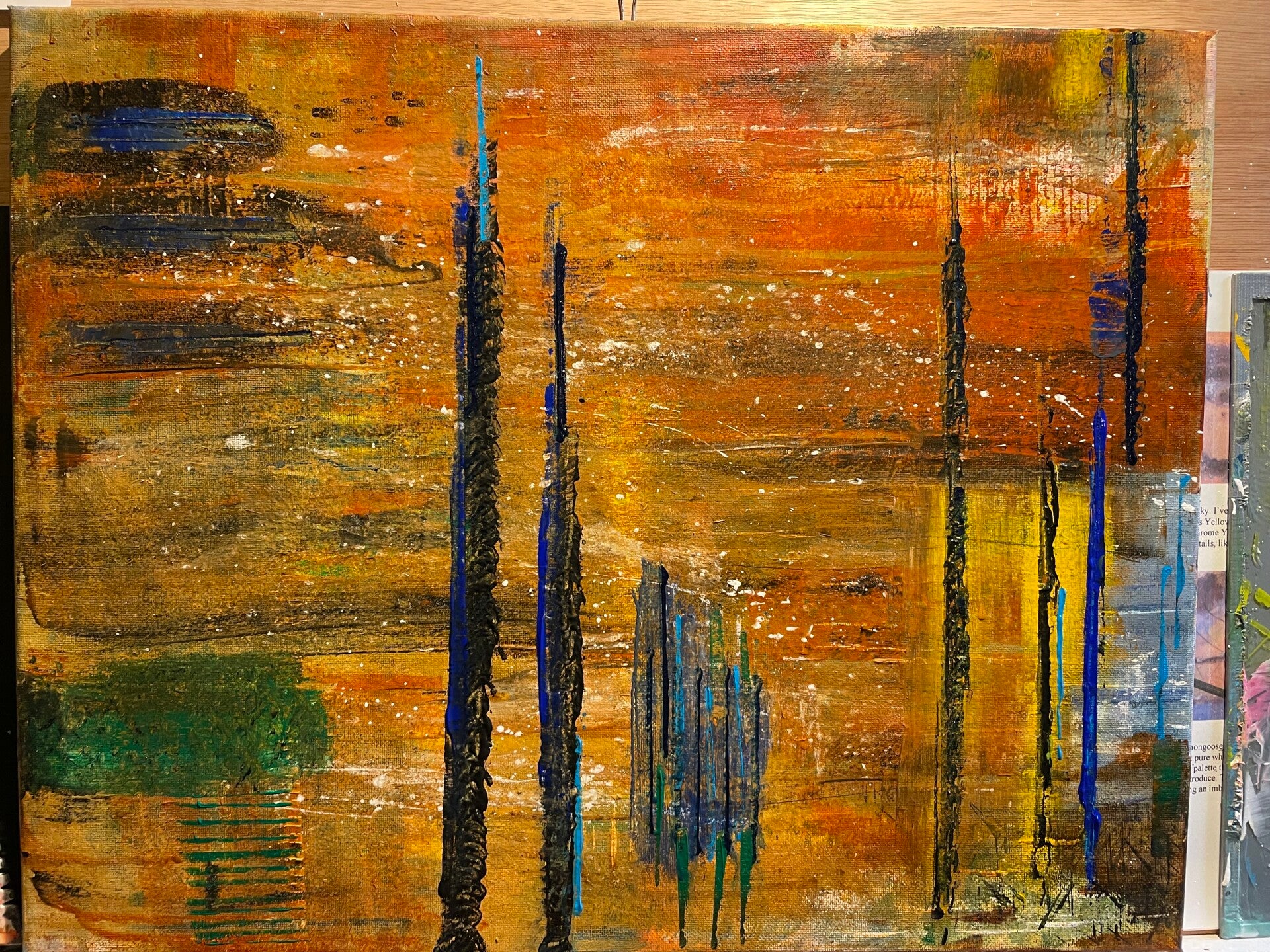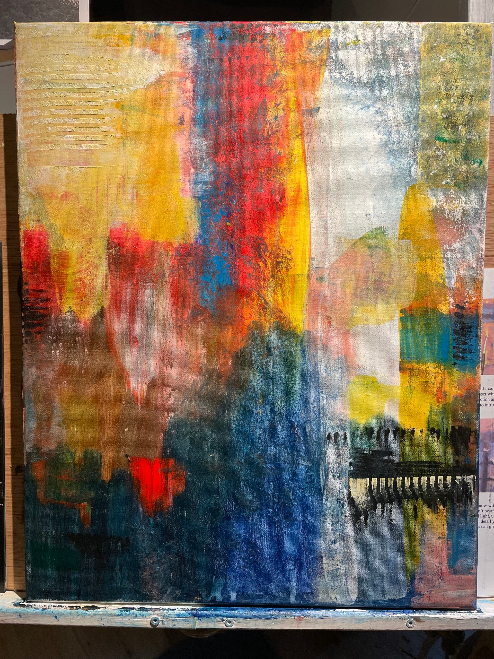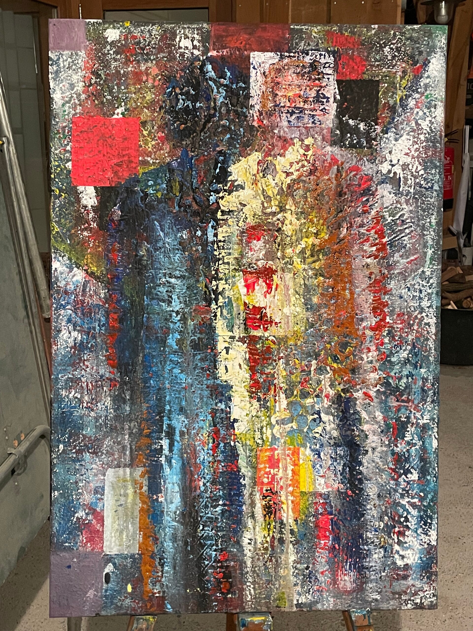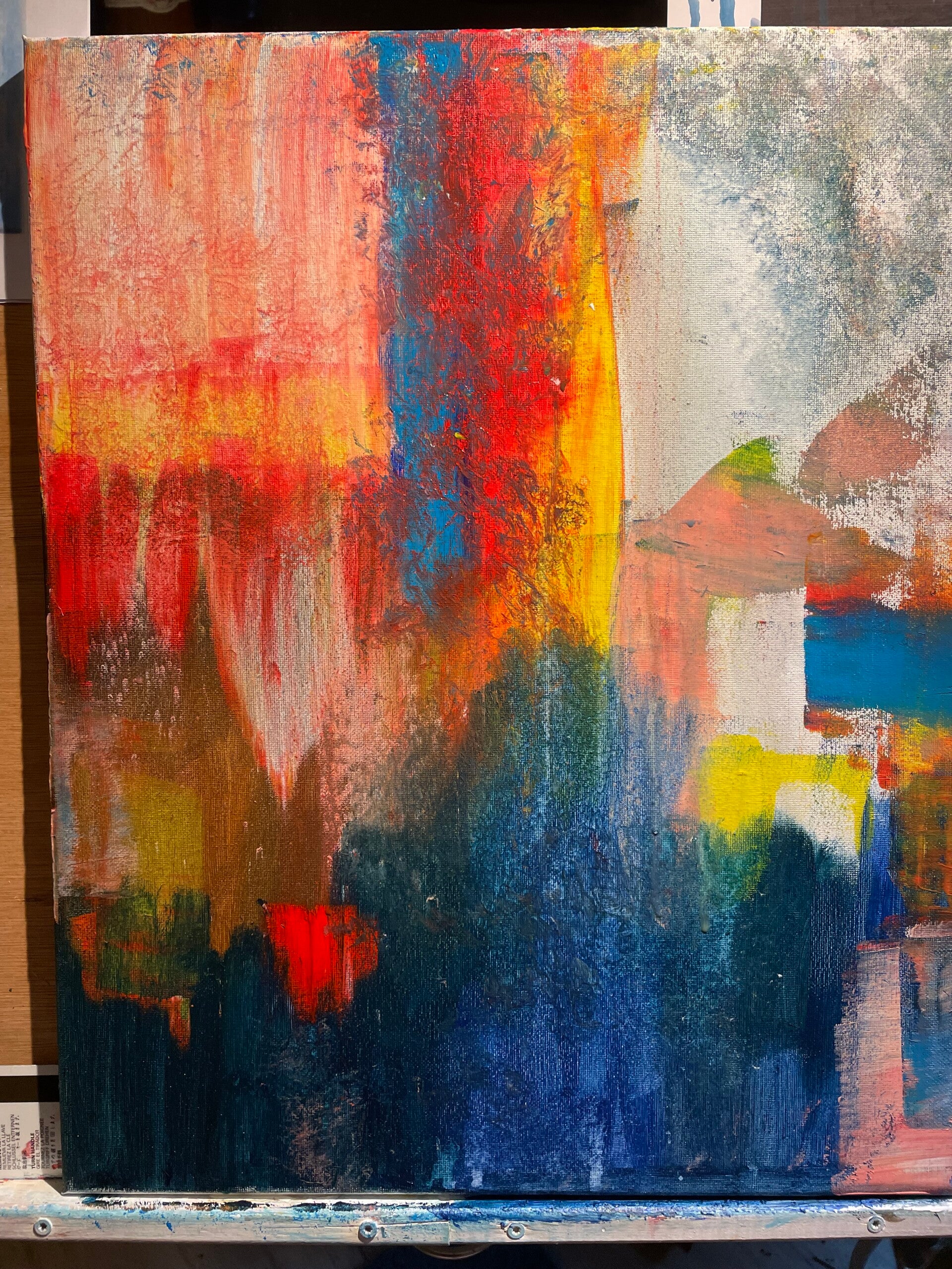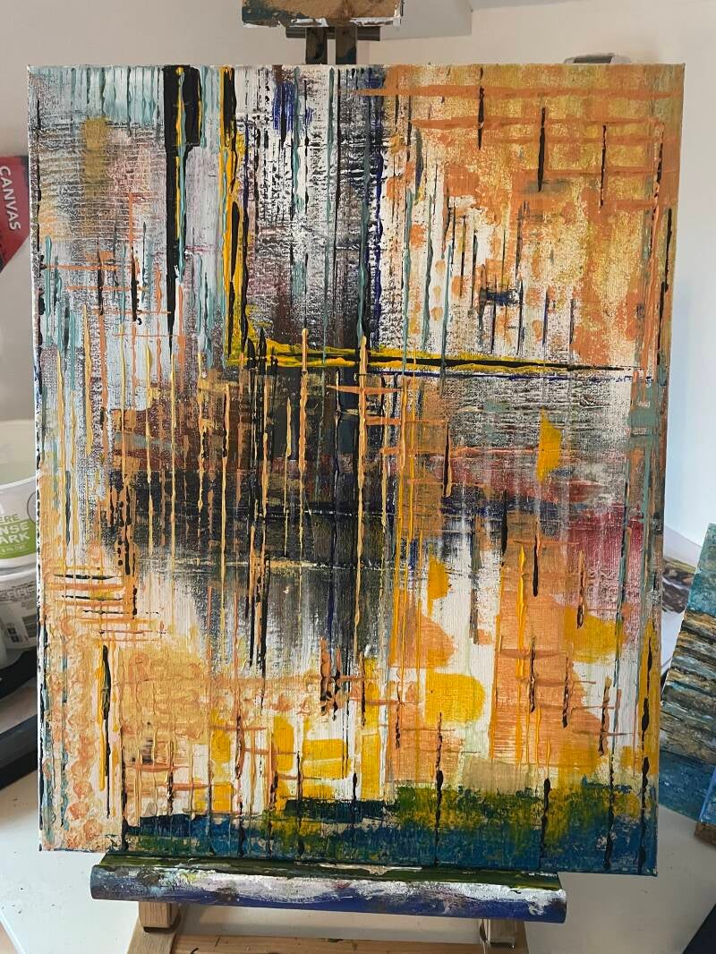 Dat is hier ook het geval: wat begon als een compositie in rood, zwart en blauw, veranderde naar een combinatie van oranje, rood en groen, en evolueerde uiteindelijk naar een harmonieus samenspel van oranje en geel, met accenten in blauw, wit en zwart.